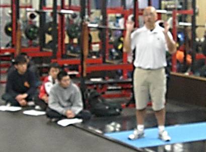 5日間日程の初日2講義目は長畑芳仁氏(日体協ATC、日本ストレッチング協会理事長) によるフィットネストレーニング理論と実技であった。 実技に先立ちストレングス・トレーニングにおける一般性とローイングを考慮した特異性について説明がされた。